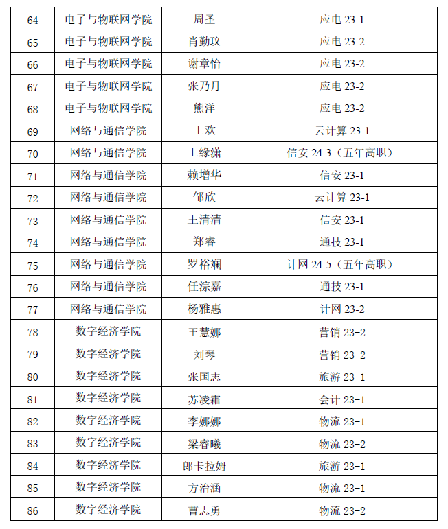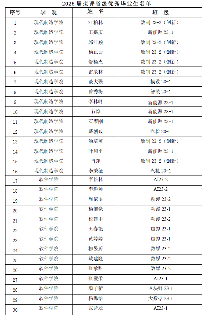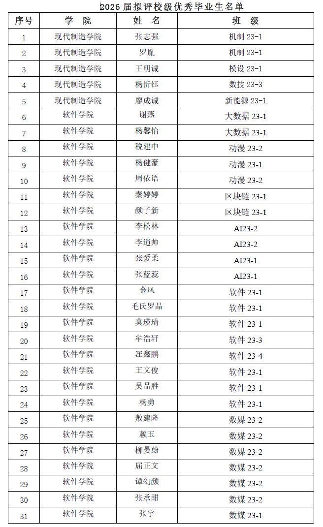 按照四川省教育厅《关于做好四川省普通高等学校优秀毕业生评选认定办法的通知》(川教函〔2020〕622号)和学院《关于评选2026届“优秀毕业生”的通知》(川信职院学〔2025〕67号)文件要求,经学生本人申请、各二级学院评选推荐、党委学生工作部审核无异议后,现将2026届拟评优秀毕业生名单向广大师生予以公示(见附件1、附件2),公示5个工作日(11月24日-11月28日)。