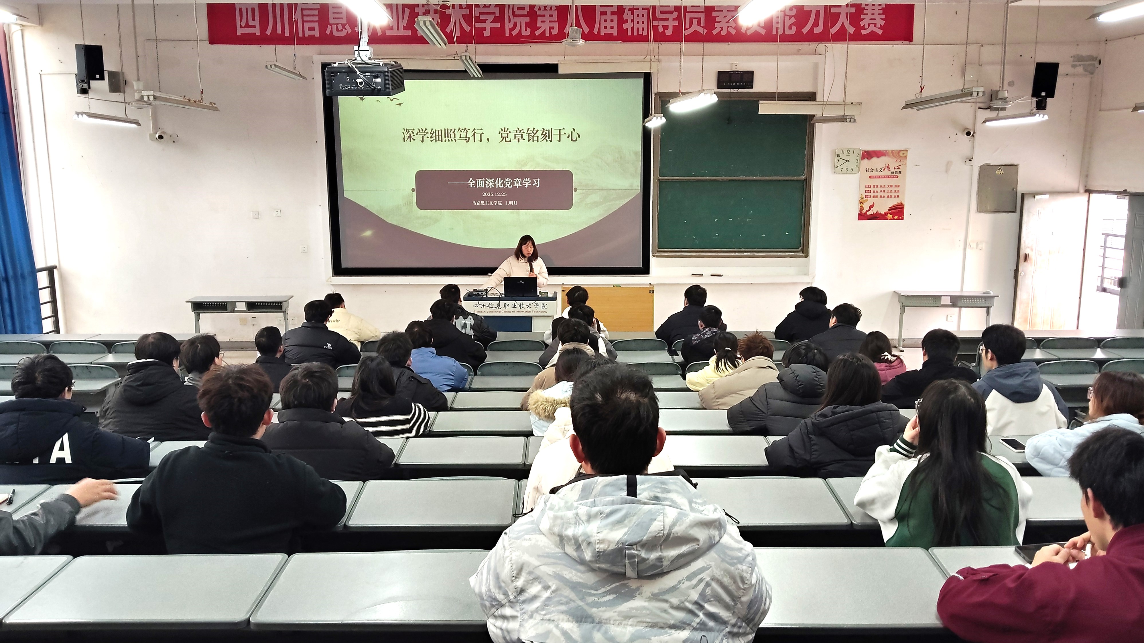 12月25日,智能控制学院在“雪峰社区”电气楼2312教室开展“深学细照笃行,党章铭刻于心——全面深化党章学习”专题讲座。邀请马克思主义学院教师王明月担任主讲,学院全体预备党员、入党积极分子参加讲座。
