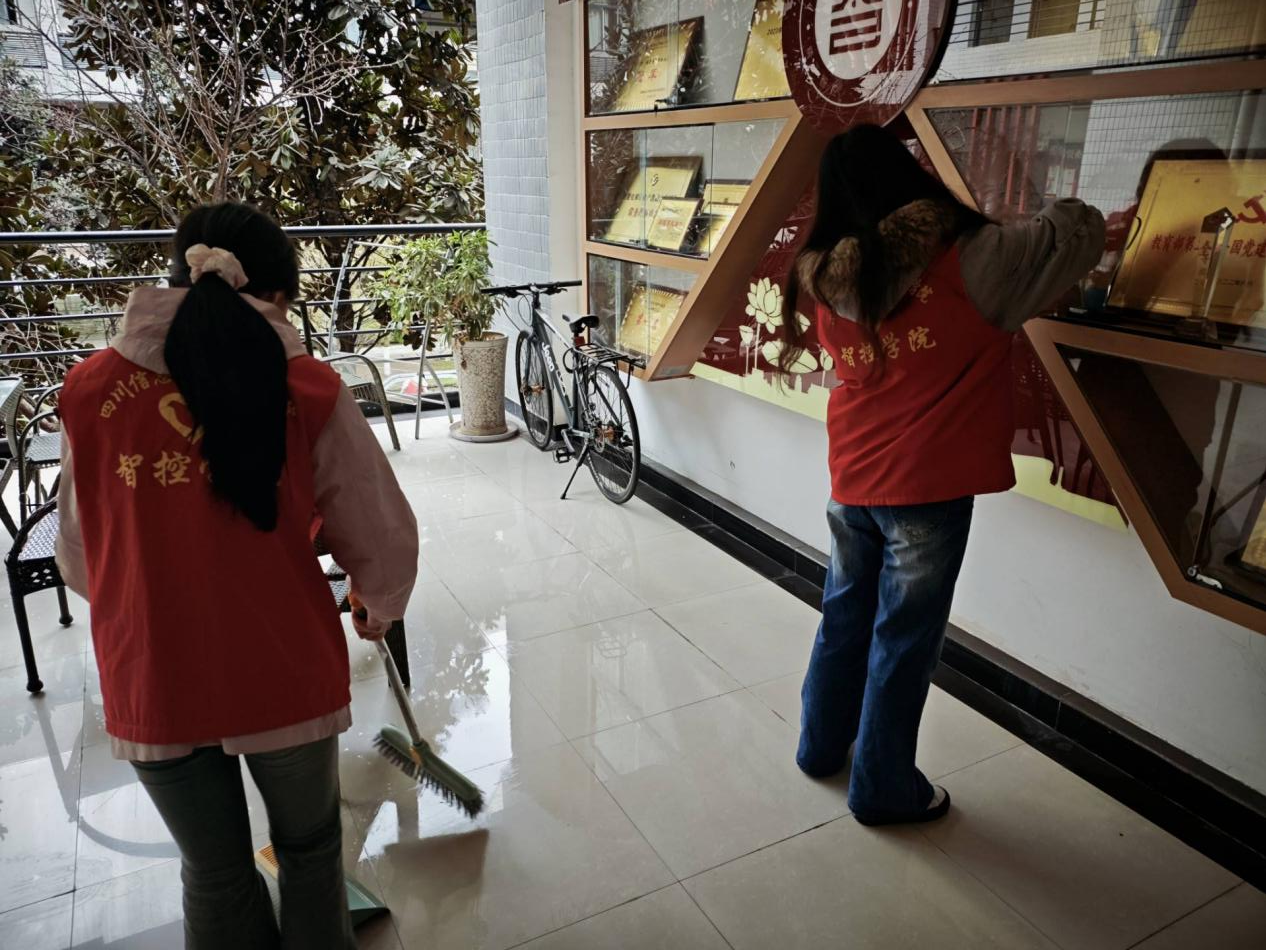 活动现场,志愿者们分工明确,手持清洁工具,对电气楼内外公共区域进行了全面清扫。同学们仔细清洁地面,并认真擦拭了门窗、展示柜等公共设施。