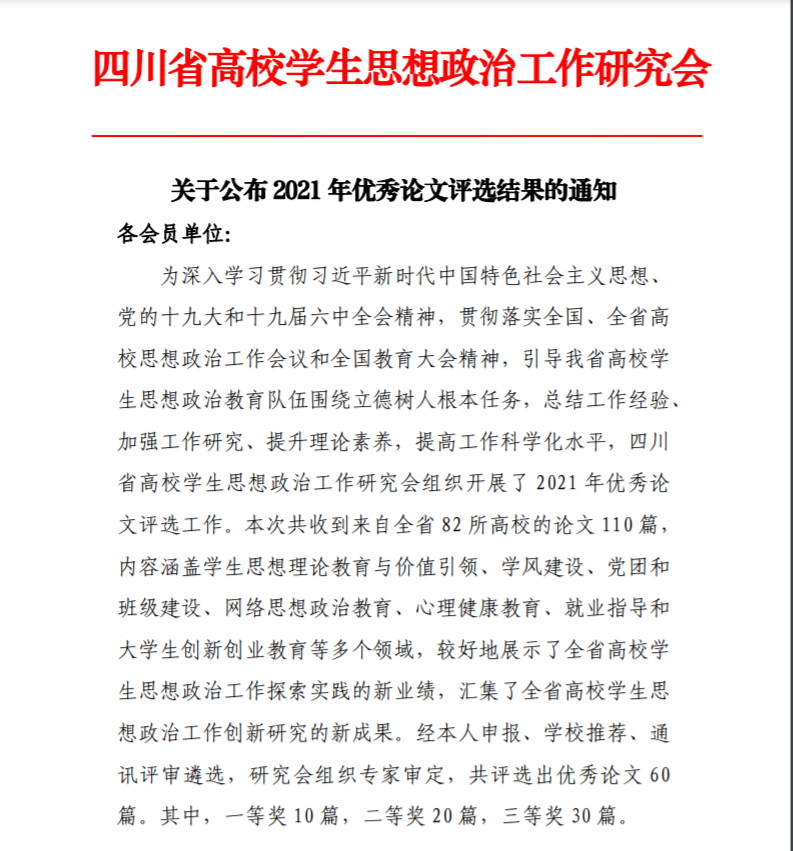 据悉,四川省高校思想政治工作研究会隶属省教育厅宣传思想与统战工作处,负责协调、组织和推动四川省思想政治工作研究,并提出工作建议。本次优秀论文评选共收到来自全省82所高校的论文110篇, 内容涵盖学生思想理论教育与价值引领、学风建设、党团和班级建设、网络思想政治教育、心理健康教育、就业指导和大学生创新创业教育等多个领域,共评选出优秀论文60篇,其中一等奖10篇,二等奖20篇,三等奖30篇。