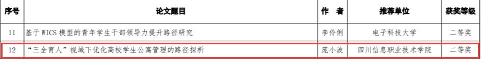 近日,学生教育与发展研究中心平台成员庞小波同志撰写的《“三全育人”视域下优化高校学生公寓管理的路径探析》学术论文,荣获四川省高校思想政治工作研究会2021年优秀论文二等奖,表明我校学生公寓管理工作取得标志性成果。