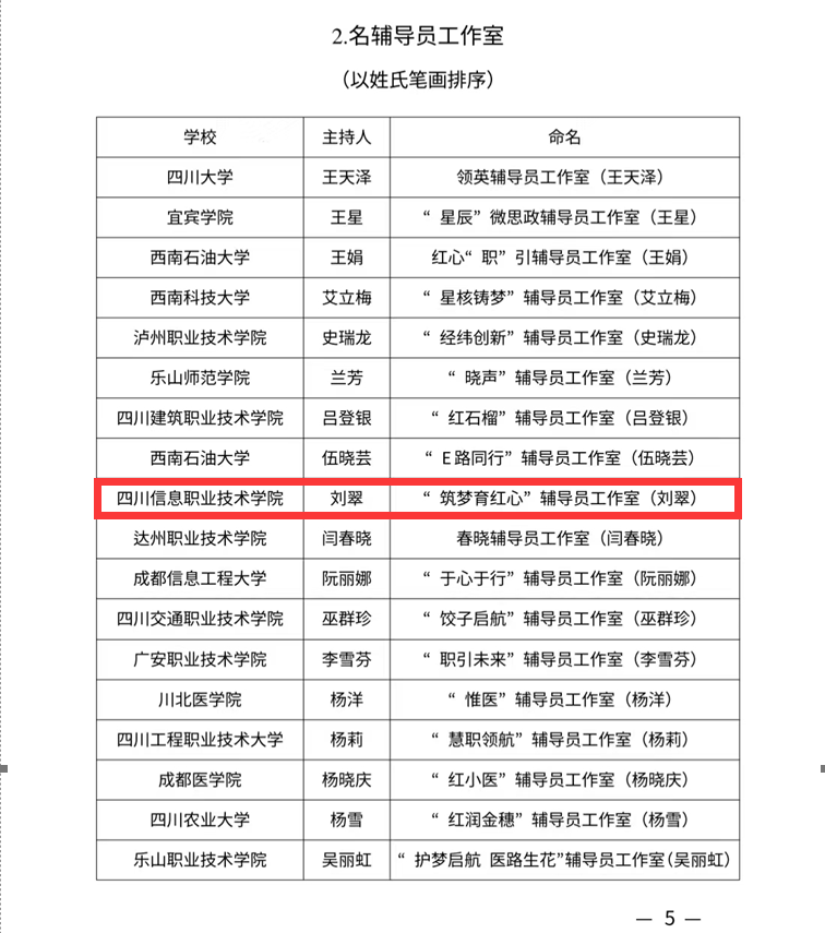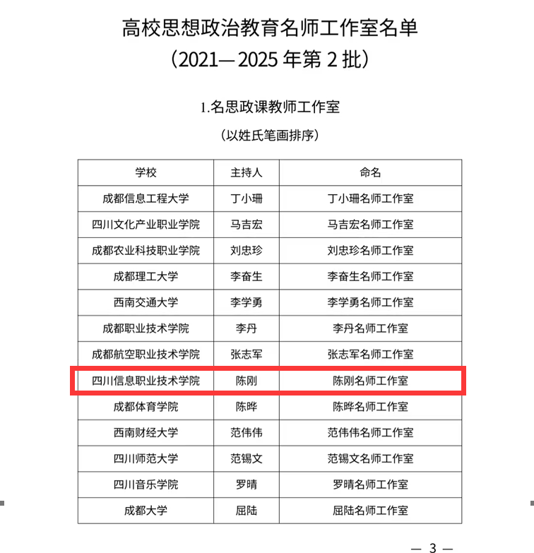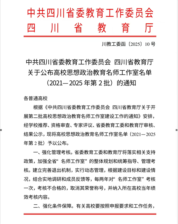 近日,中共四川省委教育工委、四川省教育厅公布了(2021-2025年第2批)高校思想政治教育名师工作室名单。其中,我院马克思主义学院院长陈刚主持的“陈刚名师工作室”入选“高校思想政治教育名思政课教师工作室”、智能控制学院辅导员刘翠主持的“筑梦育红心”辅导员工作室入选“高校思想政治教育名辅导员工作室”。