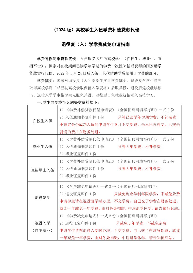 高校学生入伍学费补偿贷款代偿退役复(入)学学费减免申请指南(2024版)