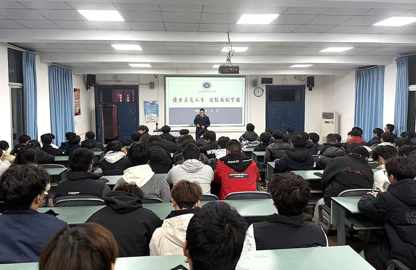 11月19日,智能控制学院高级工程师陈伟老师在“东坝社区”阶梯教室为该院2025级电梯工程技术专业学生开展《撸力点亮人生,技能成就梦想》专题讲座。讲座围绕职业教育政策解读、专业内涵解析、就业前景展望及实训实操等板块,为同学们勾勒技能成才路径,点燃职业奋斗热情。